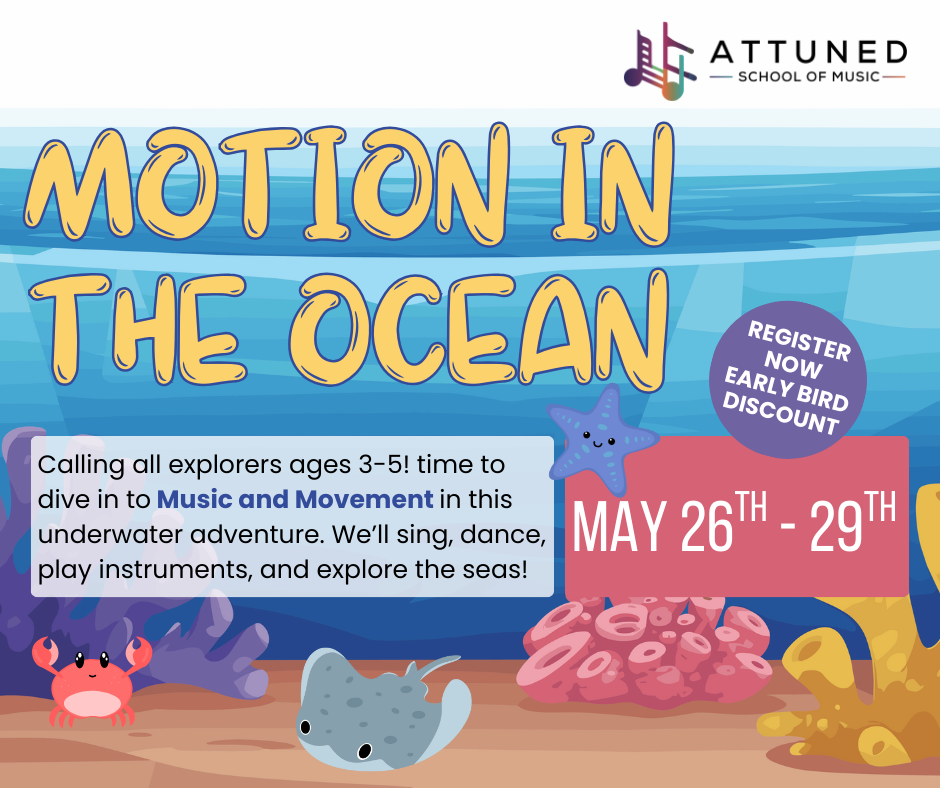Motion in the Ocean is a joyful preschool music and movement camp where little ones dive into sound, song, and creative movement inspired by the sea! Through playful singing, dancing, instrument exploration, and imaginative ocean adventures, children will explore musical concepts like beat, high and low sounds, and expressive movement—all in a developmentally appropriate, hands-on way.